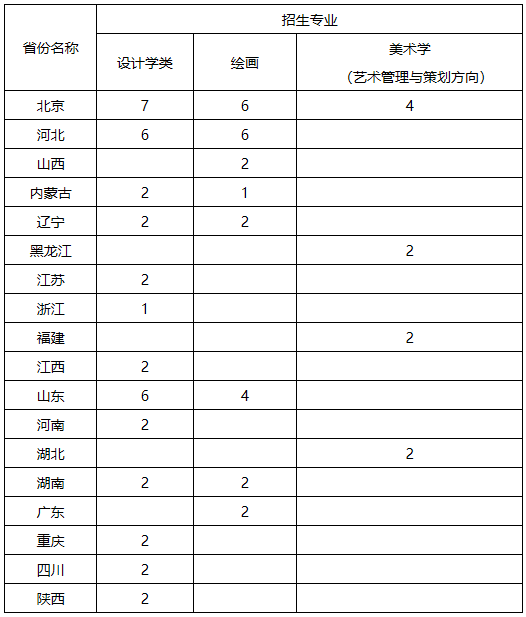 2.根据各省级招生考试机构要求,艺术类(美术)须分科类投档录取的省(区、市)招文科或历史类,不分科类投档录取的省(区、市)不限考生科类。各专业分省招生计划以各省级招生考试机构实际公布的为准。